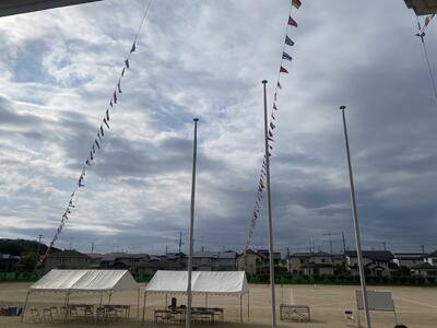 校庭に貼られる万国旗の準備も万端!8時半から開会式!