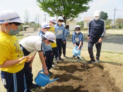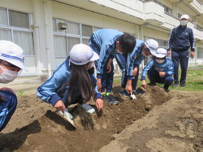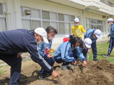 理科の先生とジャガイモを植えて。