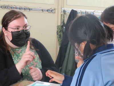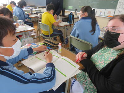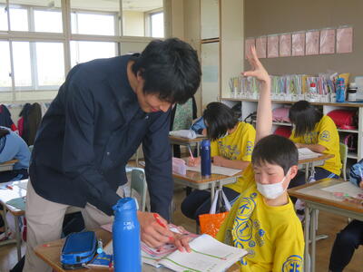 ALTの先生と、推進リーダーの先生が次々と子供たちのノートを見ます。
