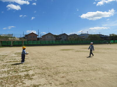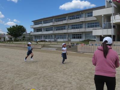 校庭の真ん中では、いろいろな学年がまざっての鬼ごっこ。