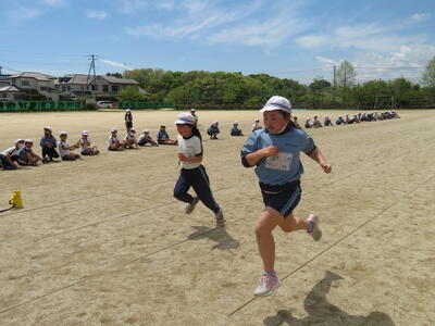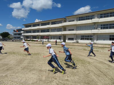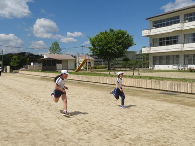 3校時、3年生。運動会に向けて、タイムを計っていました。