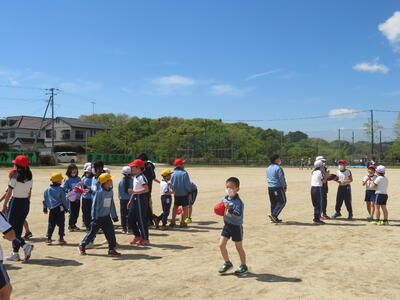 4年生が1年生と一緒にサッカーをして遊んでいました。