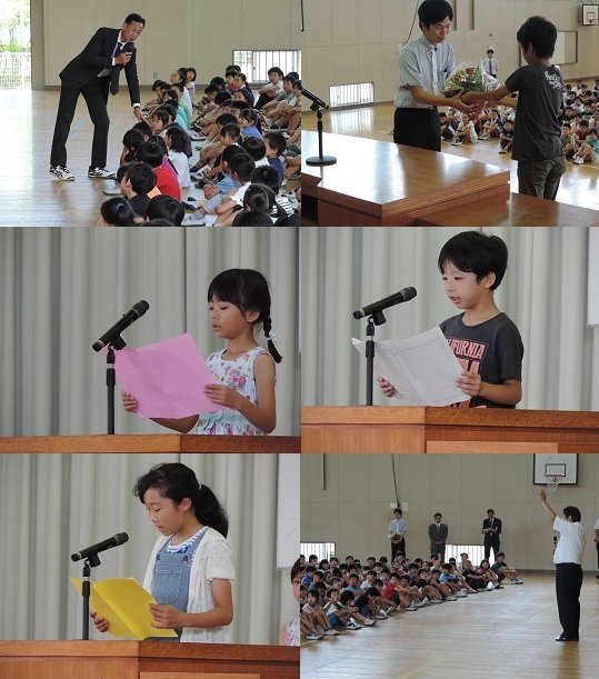 72日間の1学期も無事終業式を迎えることができました。終業式では、校長先生のお話のあと、1学期でお別れとなる髙崎先生に、代表児童がお礼の言葉を言いながら花束を渡しました。その後2、4、6年生の代表児童による1学期の反省と夏休みの抱負の作文発表、生徒指導の先生からの夏休みの生活についての諸注意がありました。