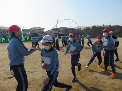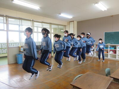 授業参観の「感謝の会」で縄跳びを披露するチーム。