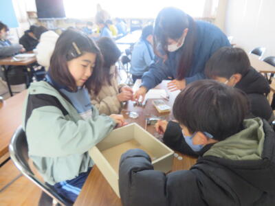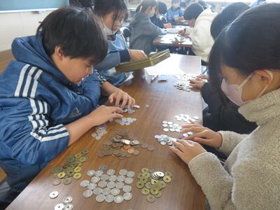 多目的教室で、能登半島地震への義援金のお金を数えています。