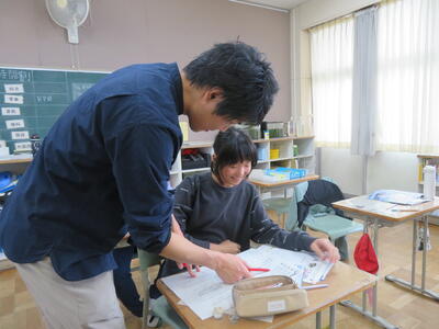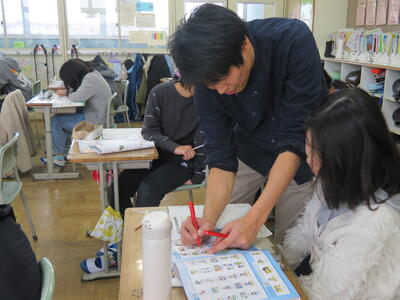 用事があったのは英語の先生。お遣いが上手にできて、シールをもらっていました。