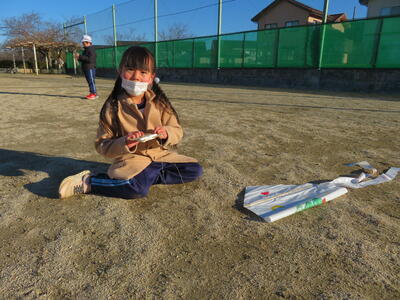 落ちた部品を探して時間が過ぎました。そして今日!「原因は何?どうしたら克服できる?」みんなで考えて再度、凧あげに挑戦!