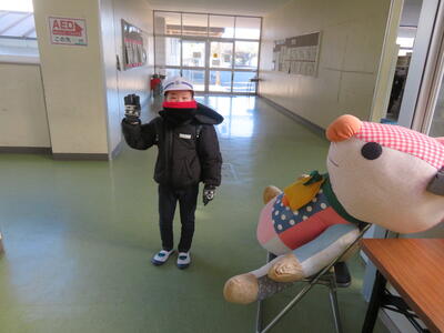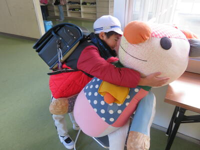 昇降口前の廊下にある大きなぬいぐるみ。子供たちに愛されています。