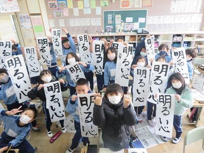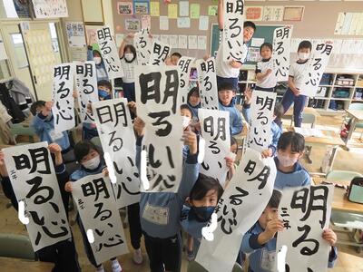 そして2時間後。文字に勢いが出てきました。「明るい心」本校、3年生にぴったりの言葉!
