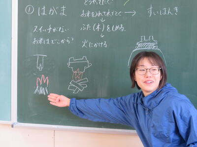 「コンセントの部分がない」「電気がまだ通ってなかったころ?」目の前の実物『かま』を見ながらどうやってご飯を炊くのかを考えていきました。