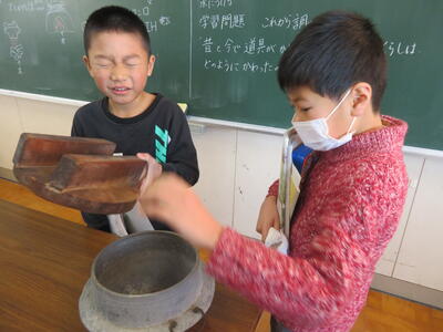 かまの蓋を持ち上げて「ひゃ~重い。昔の人は大変だ。」良い感想!