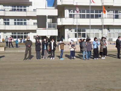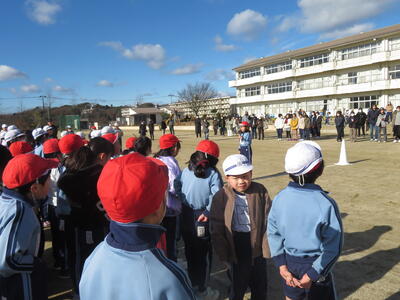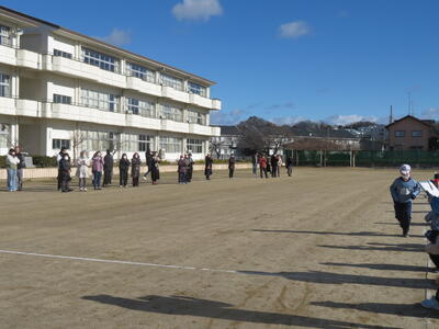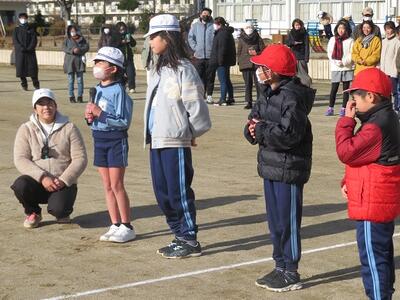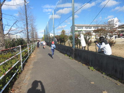 お父さんとお母さんが校庭入り口で応援していました。お子さんの姿を見つけて、お子さんの名前を呼ぶ声と拍手。