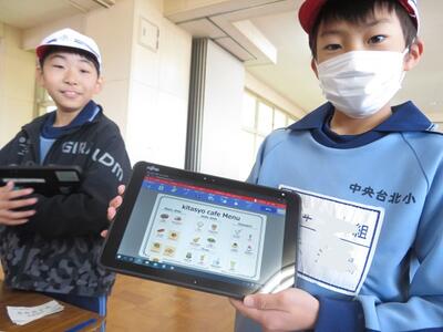 5年生は、準備してきたメニュー表を提示してカフェの店員になりきります。