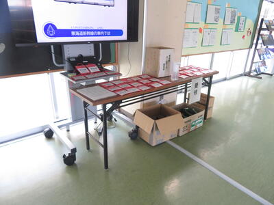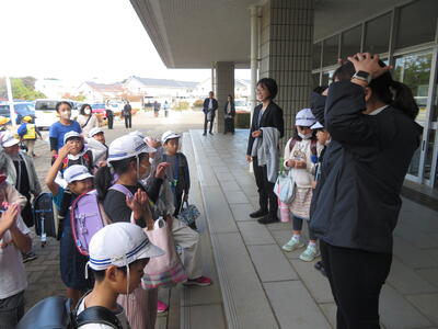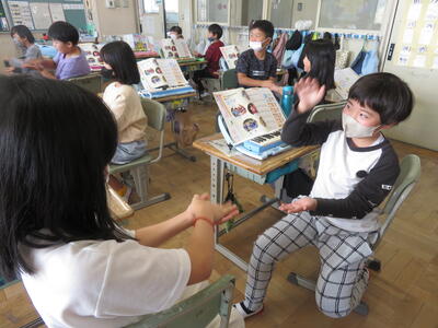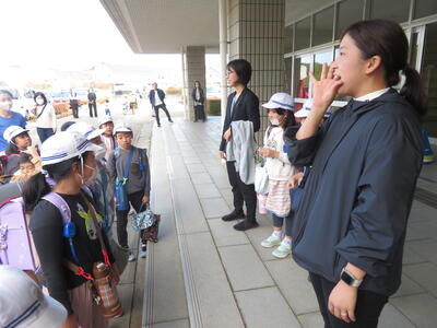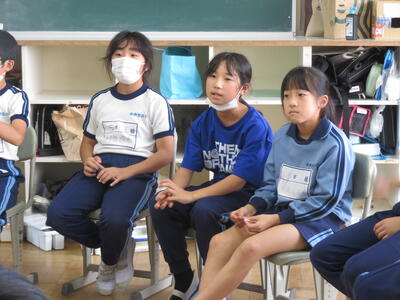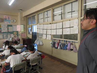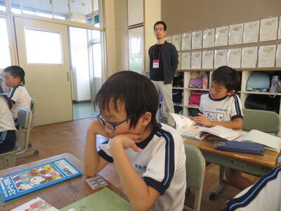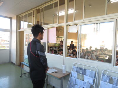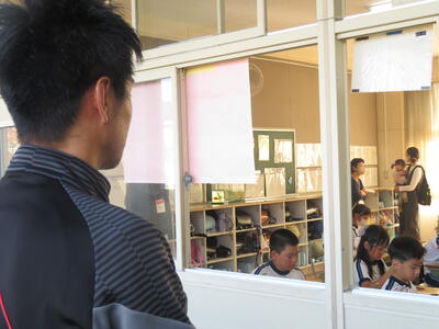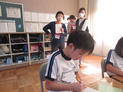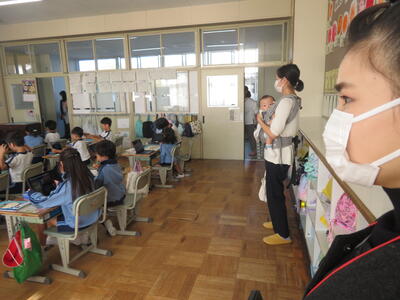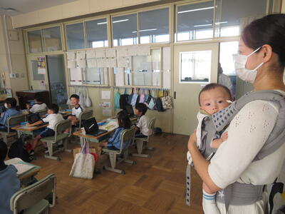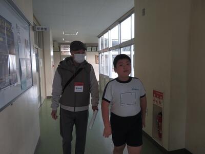 地域の方に「3年生の教室、どこですか?」と聞かれ、5年生が案内していました。