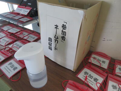 消毒のご協力を。帰りはホルダーを回収箱へ。