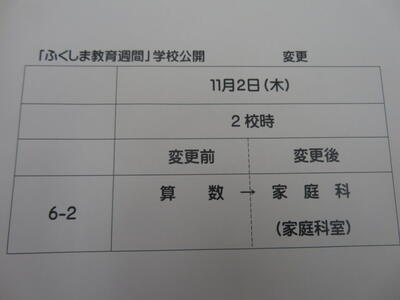 明日の2校時、6年2組に授業内容・場所の変更があります。ご確認ください。