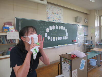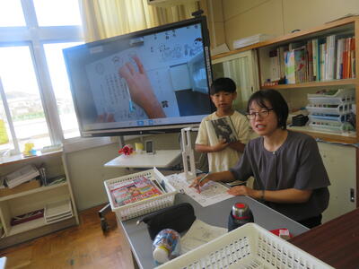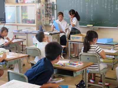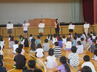 4年生、毎学期最後の日のお楽しみ。紙芝居。1学期の行事を振り返りました。