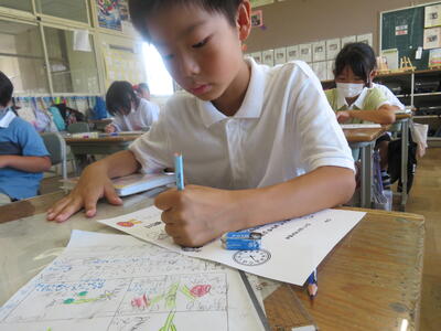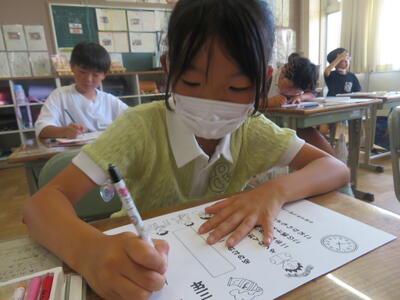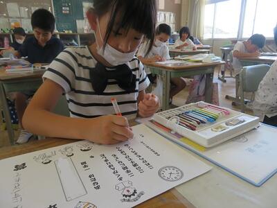 友達が褒めてもらっているのを聞きながら賞状づくり。クーラーで涼しい教室、でも取り組みは温かいです!
