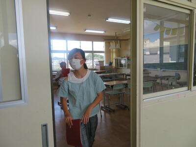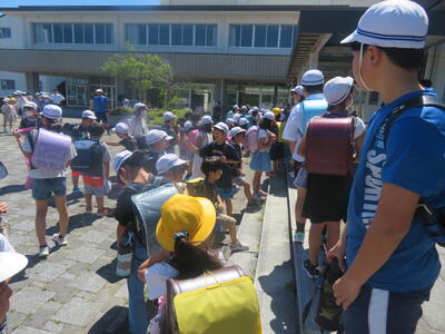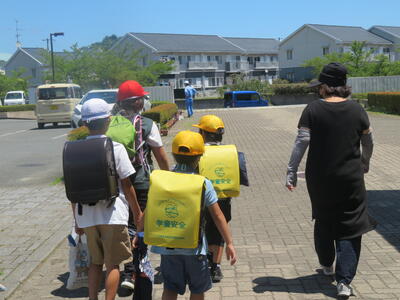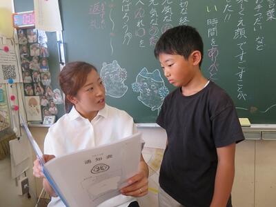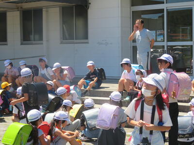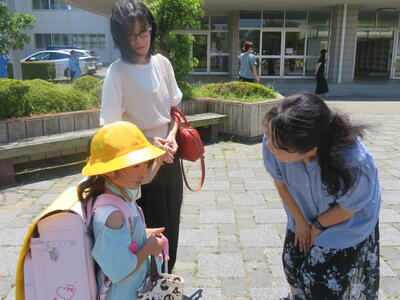 1学期最後の日、職員が子供たちの楽しい話を聞きながら見送っていました。