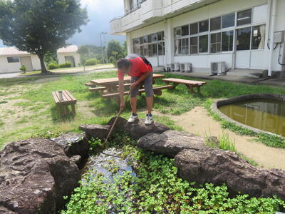 子供たちのいない校舎校地内。この時期、毎年恒例の池の水の掃除をする6年生の先生。
