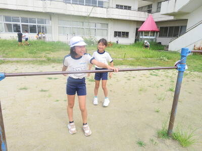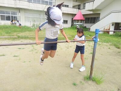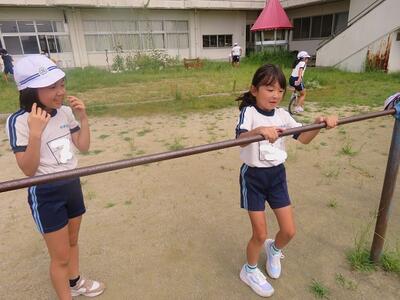 逆上がりを教えてあげている3年生女子。「足を蹴りだすと良いよ。」