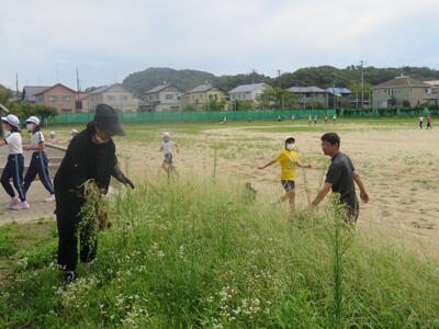 校庭の雑草が増えています。子供たちの活動を見守りながら草むしり。