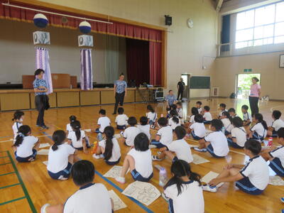 2年生からゲームの説明。「言われた数の人数でグループになってください。例えばパンダは3文字なので3人。」