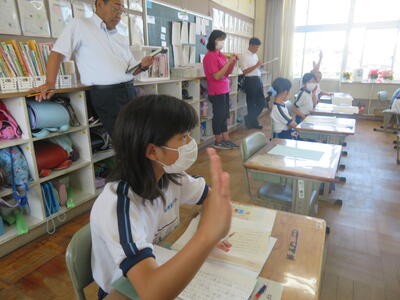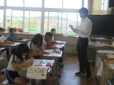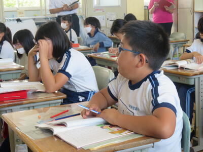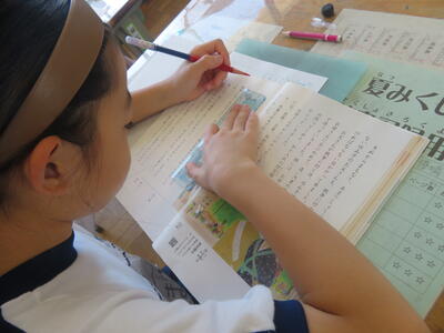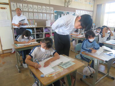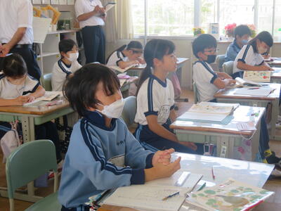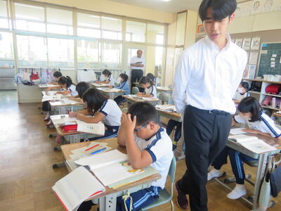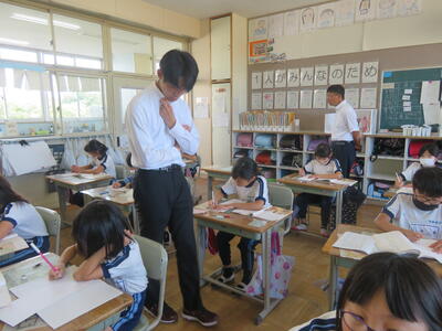 先生が歩きながら子どもたちが書いた感想を言葉にします。書けない子や思いつかない子はその言葉に影響を受けて鉛筆が動きはじめます。みんなが書けるようになる配慮です。