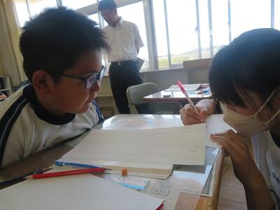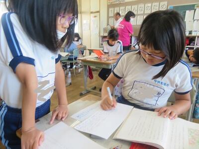 書いたことをペアで発表しながら、また影響を受けて筆が進みます。『「真似すること」は悪いことじゃない』そういいう学級の文化があるからこその姿です。