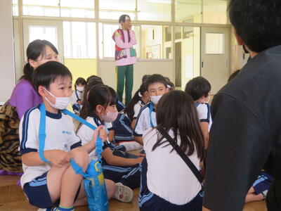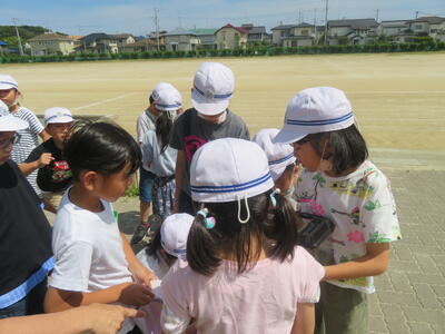 「カメラ、見て見て。」1年生に声をかけるお兄さん、お姉さん。みんな仲良し!