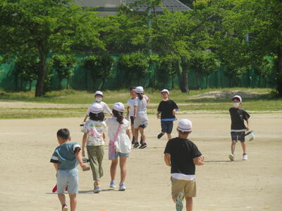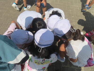 未だ虫を捕まえられず、遠くまで探しに行った班へ。「お~い、ダンゴムシのお裾分けするよ!」と声をかけていました。