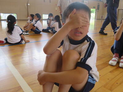 最後は宝さがしゲーム。「1年生の皆さん、目をつむってください。」