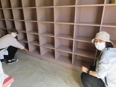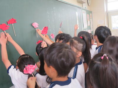 好きな方向に貼っていた赤い魚。そのうちに誰かが声をかけます。「大きな魚になって泳ぐんだから同じ向きに貼ろう」