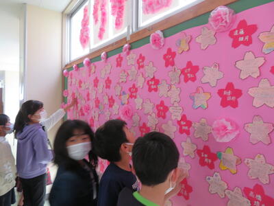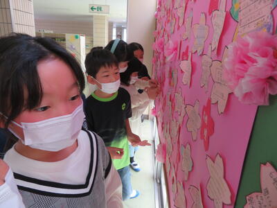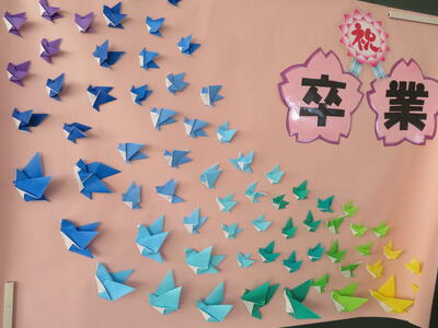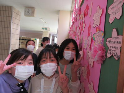 昇降口には6年生に向けて全校生、全職員からのメッセージ。