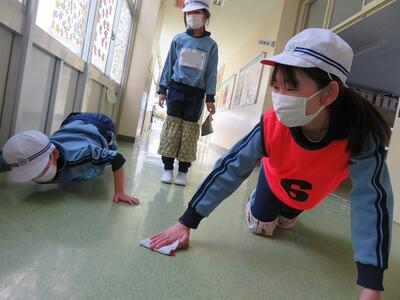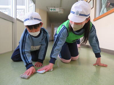 お掃除の時間。6年生が率先して床に膝をついてお掃除を教えてくれています。