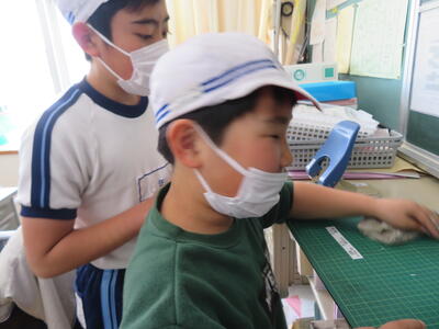 お掃除の仕方を優しく教えてくれています。卒業を間近に控えても変わらない6年生の姿。