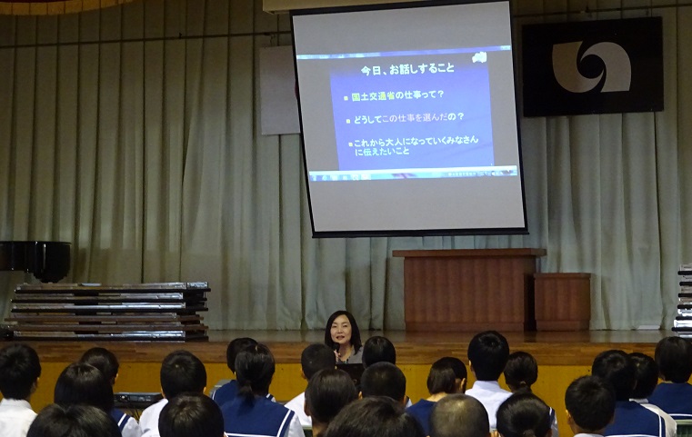 松田さんは、10代のころまでは、「どうせ自分は女性だから」と人生に夢を描けないでいました。「自分の力を世の中のために発揮しないでどうするのか」と大学の先生から叱咤激励されたことをきっかけに努力を重ね、今の自分がある、とのことでした。特に女子生徒が真剣に話に聞き入っていました。