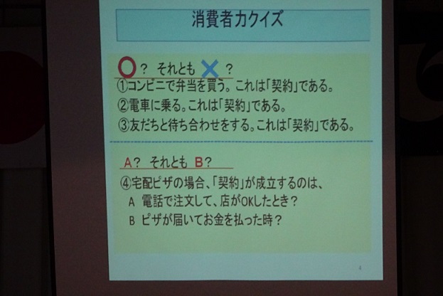 市消費者センター所長の阿久津様他2名の方からお話をいただきました。商品を売る・買うことは「契約」であり、売る人と買う人(消費者)はお互いに責任と義務を伴うこと、ネット上でも「うそ」をついて契約した場合、未成年でも保護されないことなどのお話がありました。