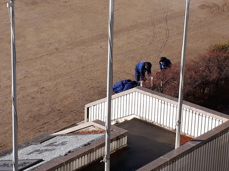 何をしているのかと言うと、スポンジを使って水たまりの水を吸い取る作業(の一環)です。