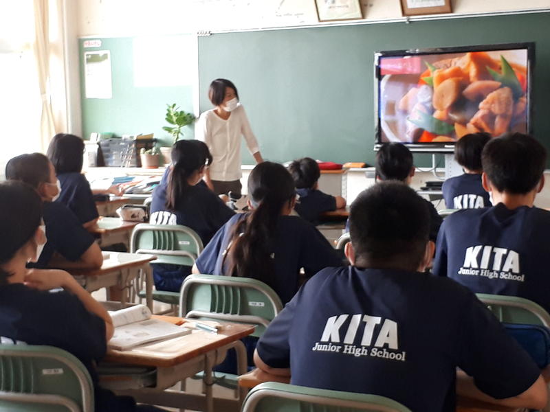家庭科です。電子黒板で「出汁(だし)のとり方」を見ています。