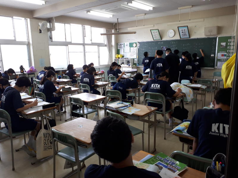こちらは社会科かな。黒板に集中中! 誰が生徒か先生か分からない~