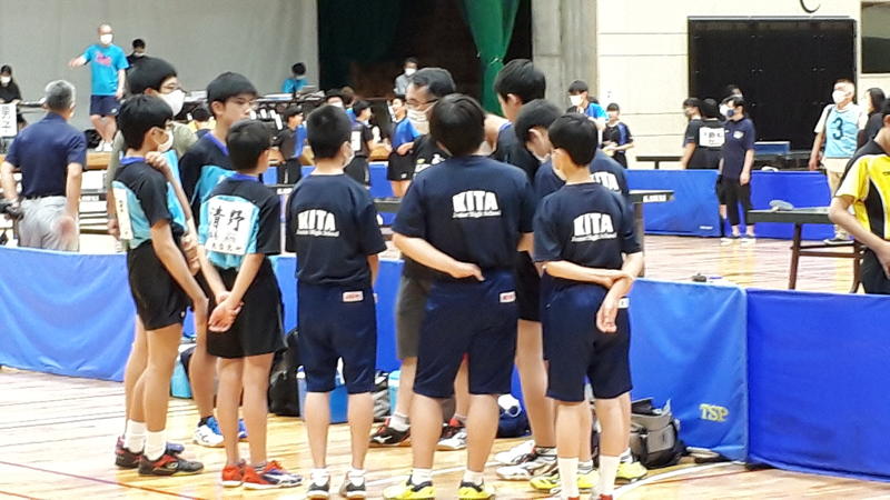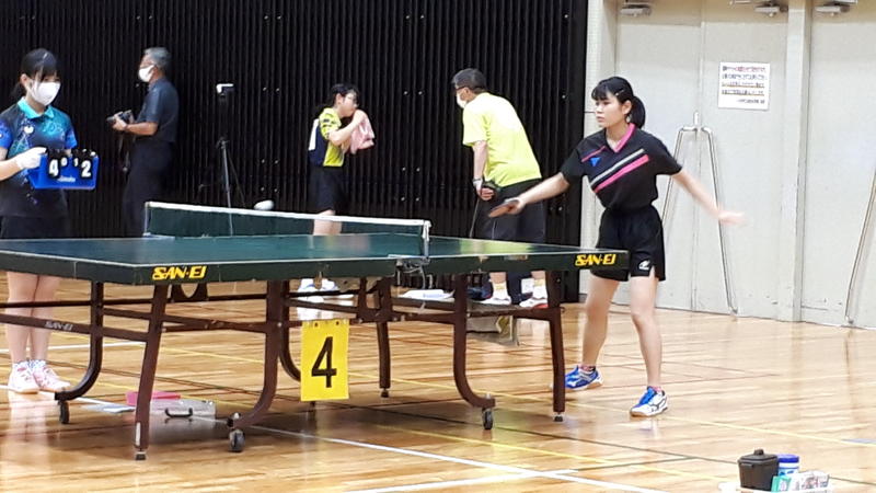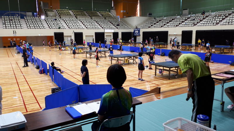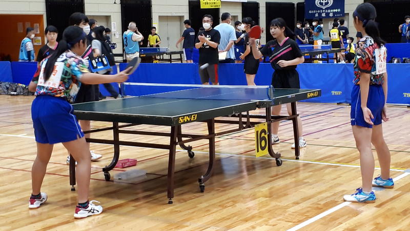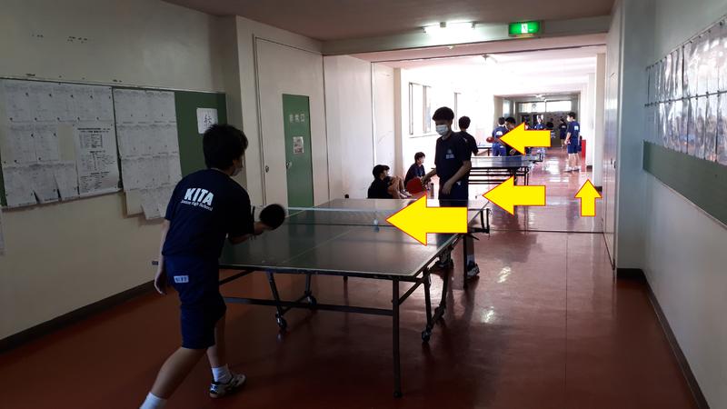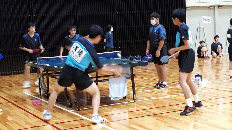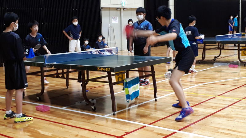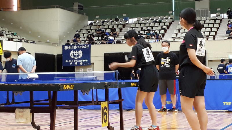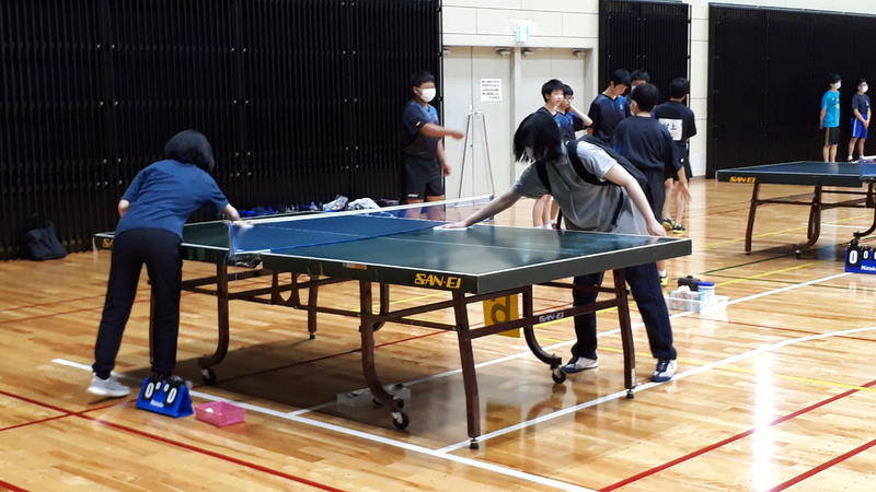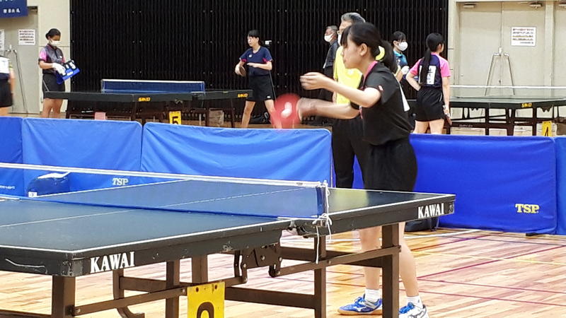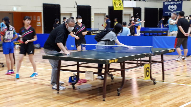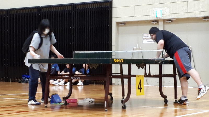 試合の合間に卓球台を除菌シートで消毒しているのは、各校の顧問の先生方です。