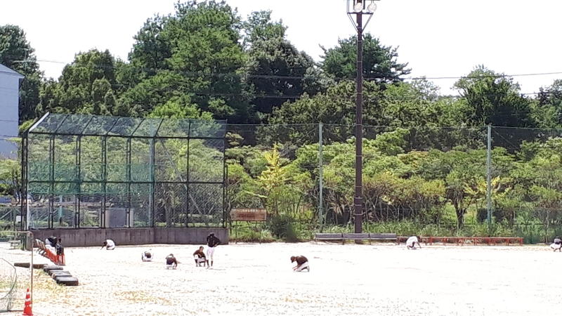グランド整備に取り組む野球部です。雑草や小石を取り除いています。