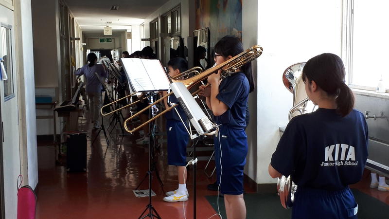 答:見ての通りです。吹奏楽部がロングトーンの最中です。