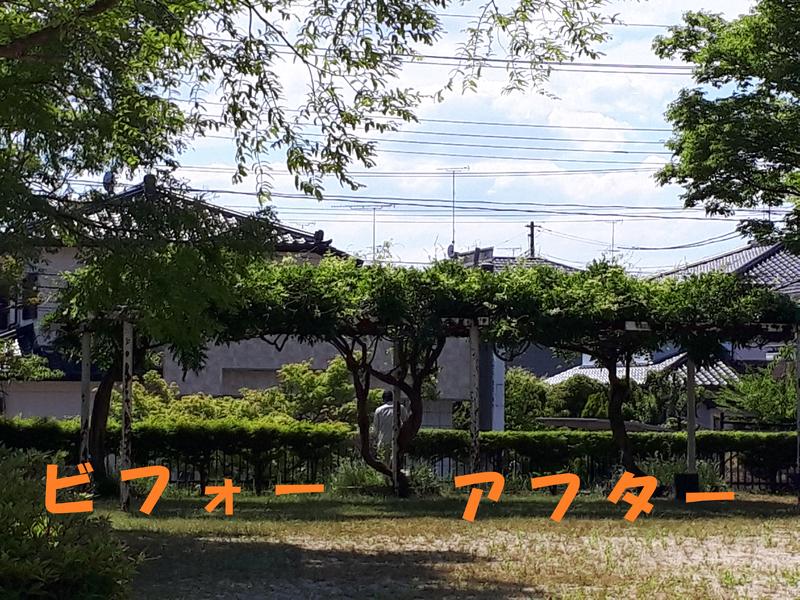用務員さんが植え込みの剪定(せんてい)をしています。