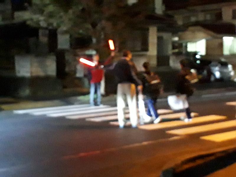 本校の職員が、ライトセーバーを持って、横断を見守り、安全確保に努めています。