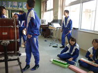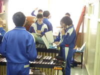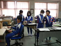 6-1は音楽の授業。「アイーダ行進曲」「威風堂々」「ハンガリー舞曲」の3曲をグループに分かれ練習中。