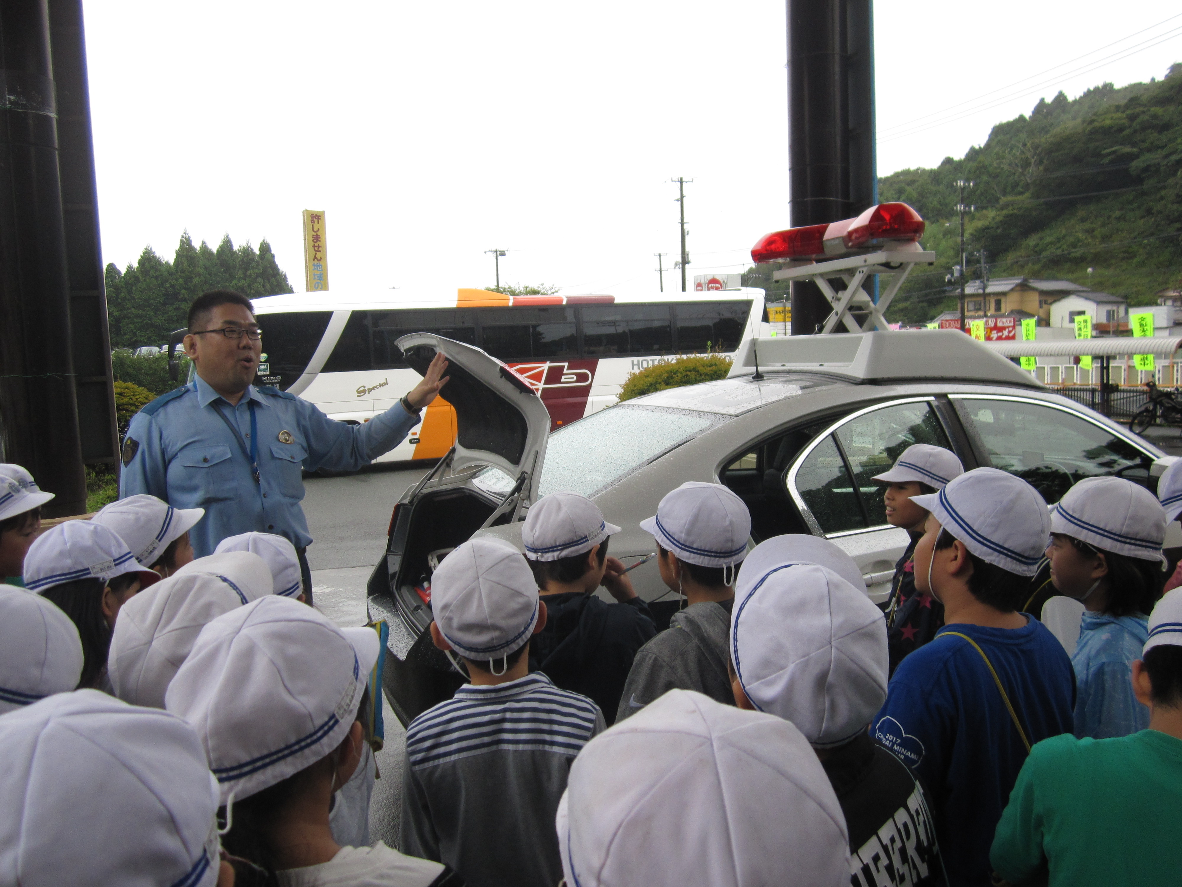 警察館の道具を触らせてもらったあとは、パトカーに乗車。ちょっと緊張?