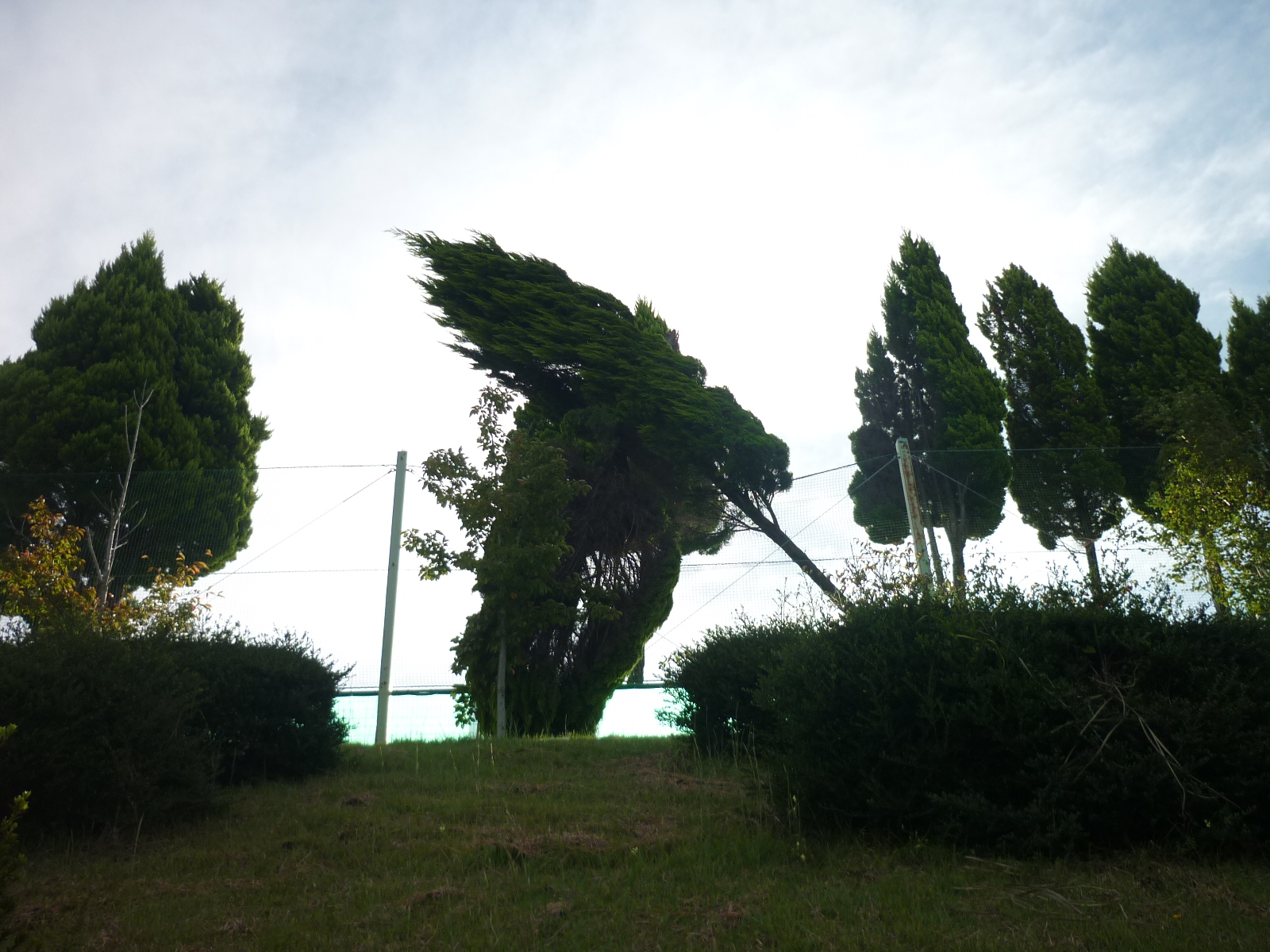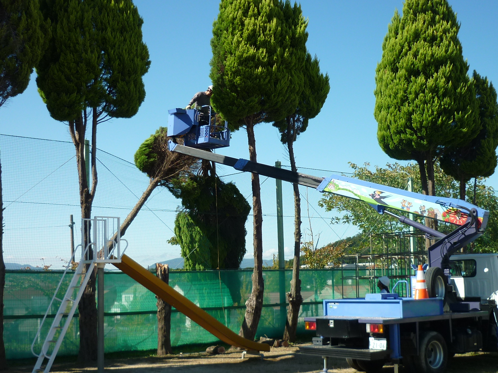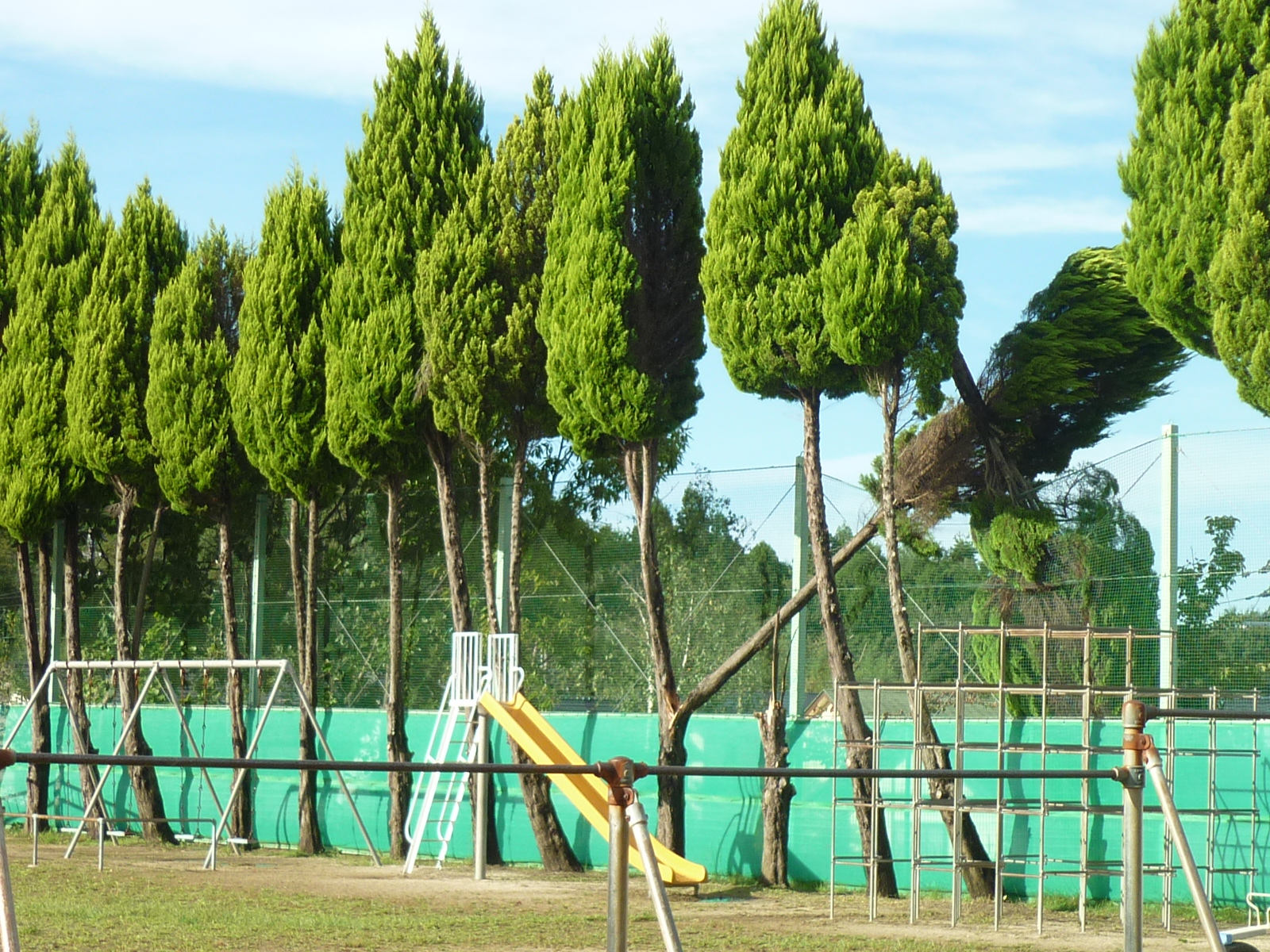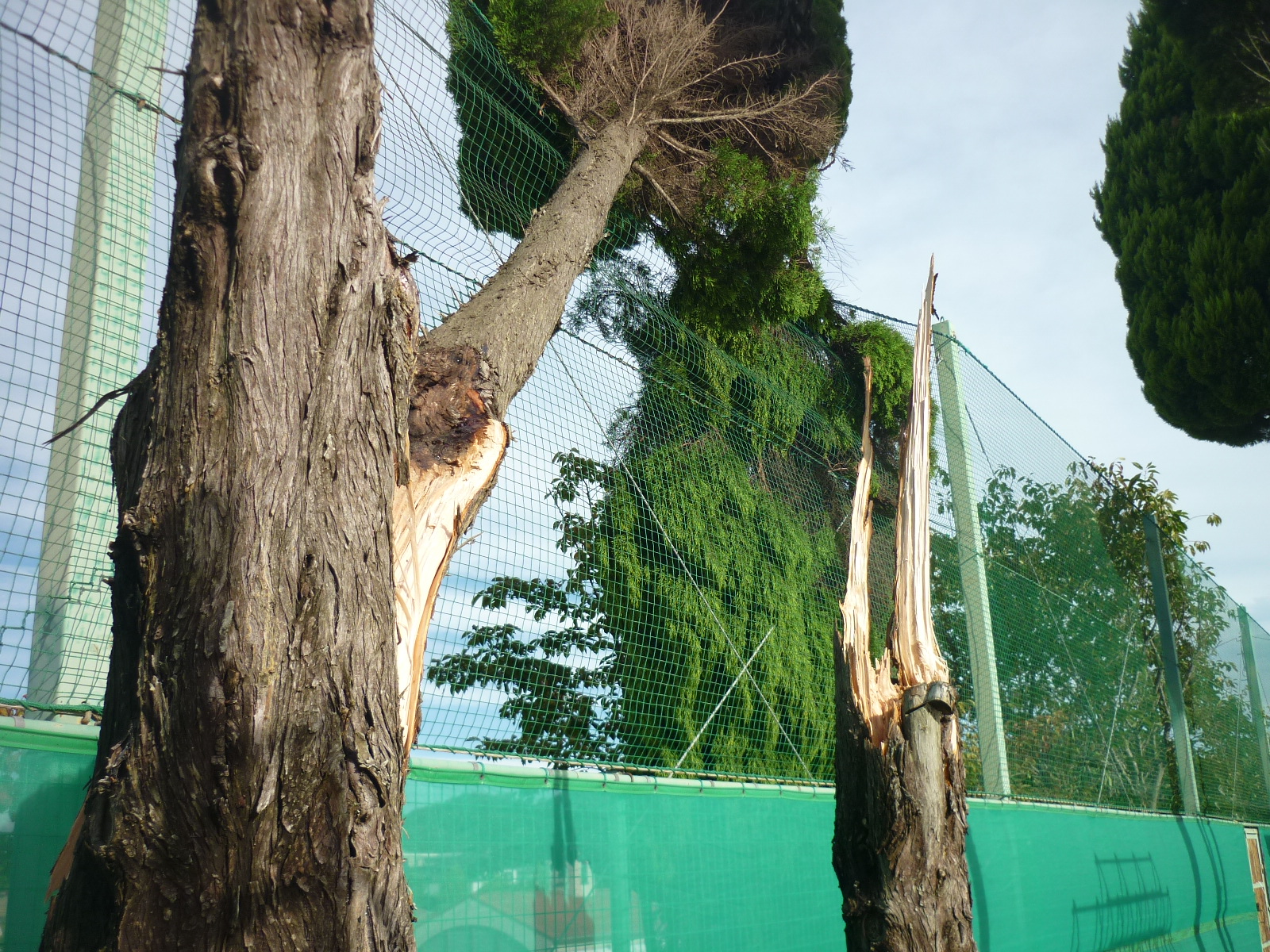 校庭西側滑り台付近のゴールドクレストと南西角の楠木が強風の影響で折れてしまいました。