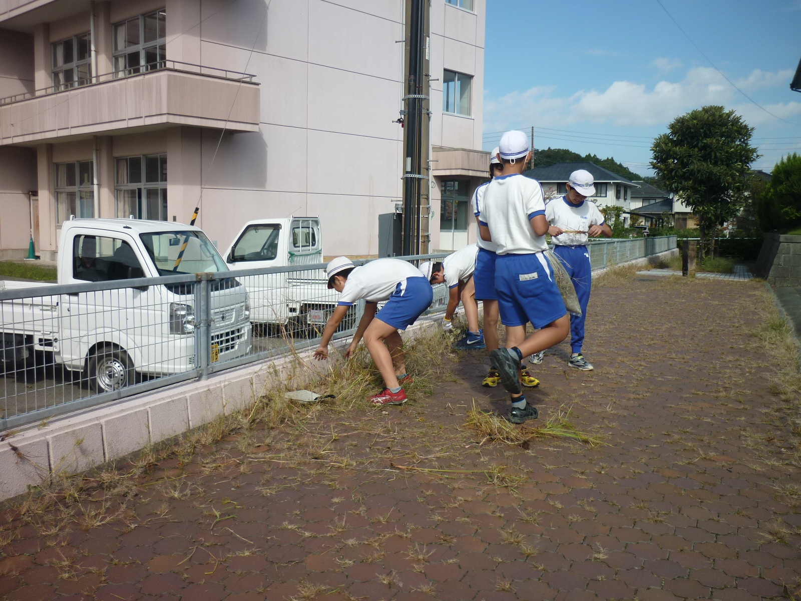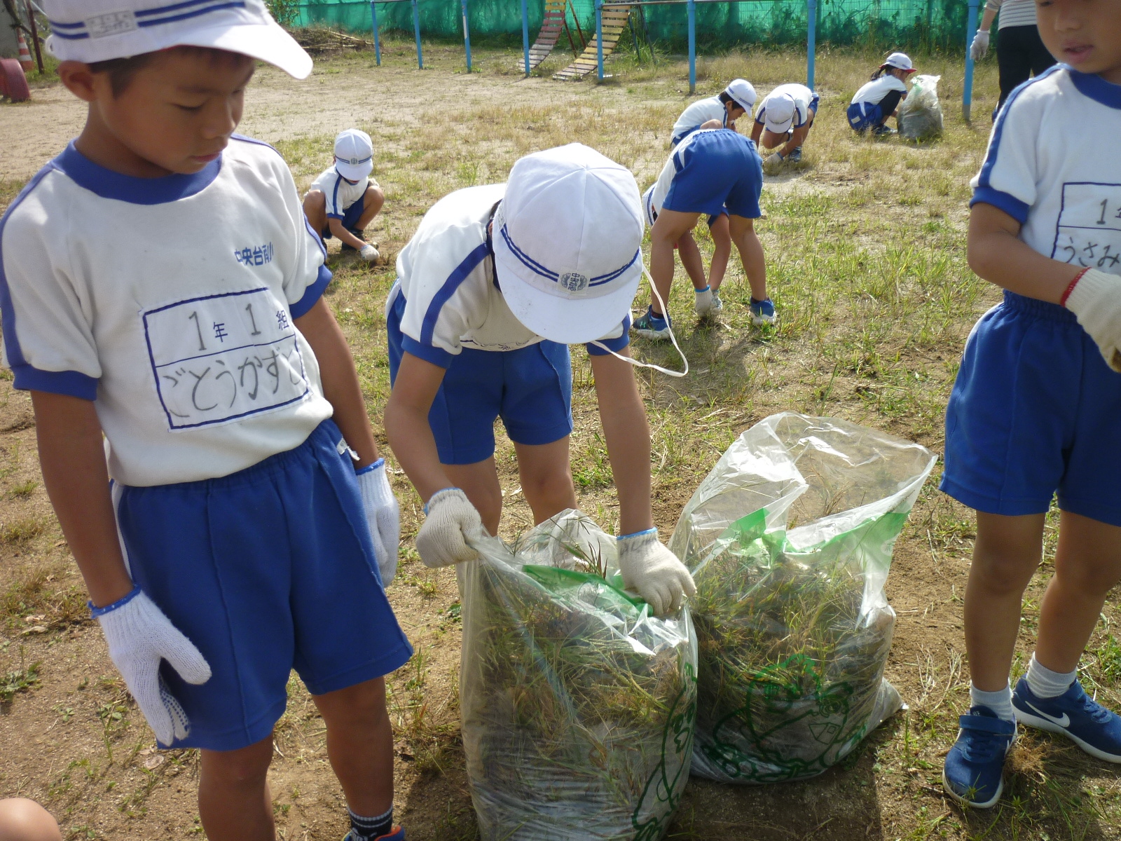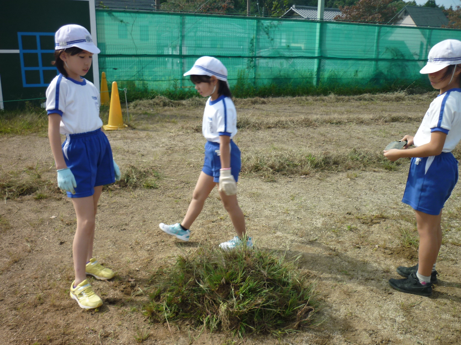 真夏の勢いはなくなってきているものの、まだ校庭に雑草は残っています。